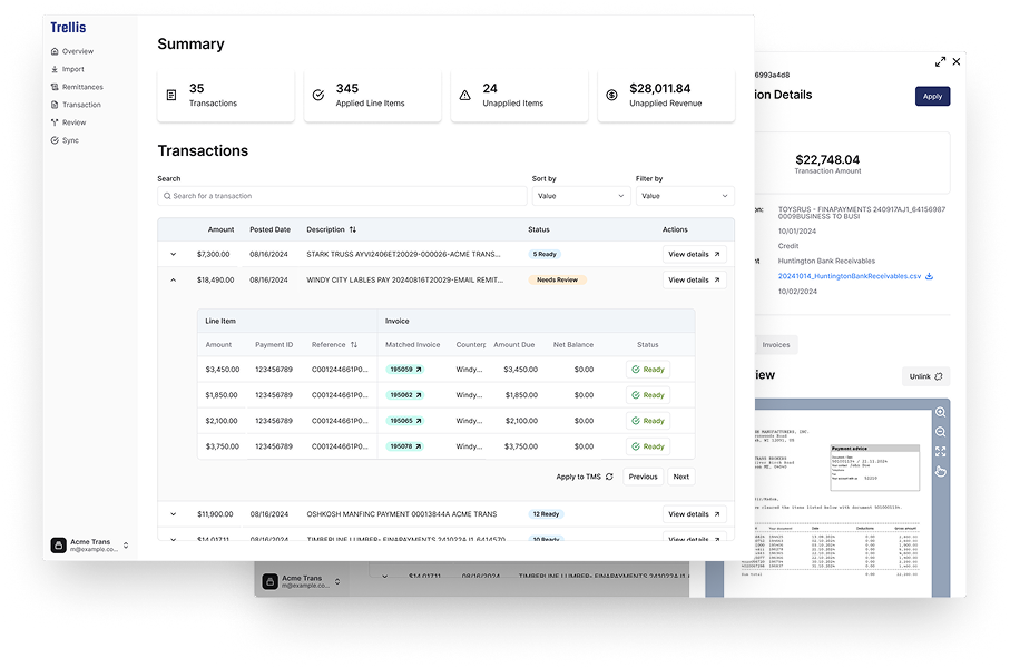 Trellis automates your 3PLs cash application by automatically applying bank payments to the correct operational item in your TMS, WMS, or accounting system.