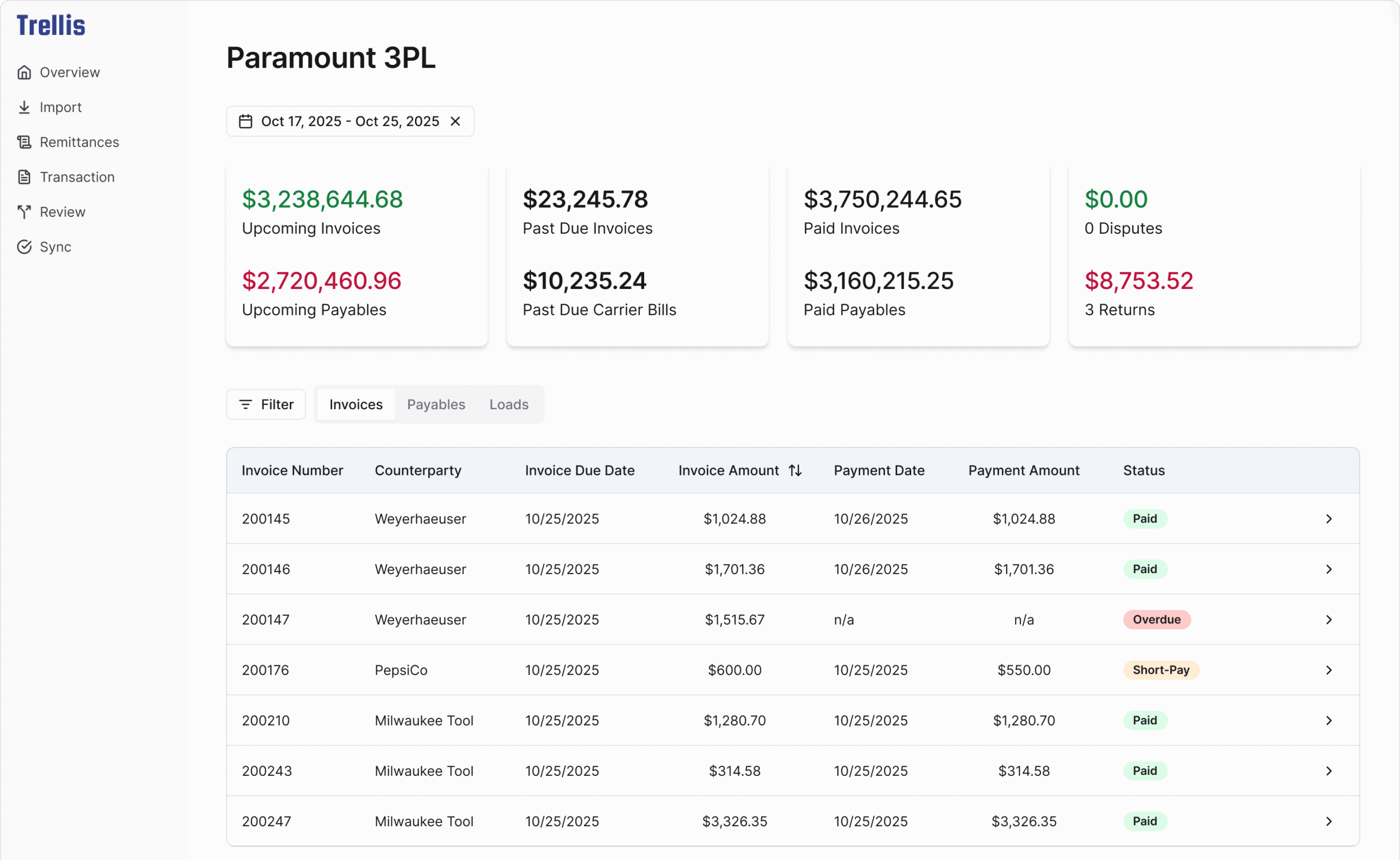 Trellis sits on top of your TMS or WMS systems, allowing your 3PL to unify all open invoice and payable data across your numerous platforms.